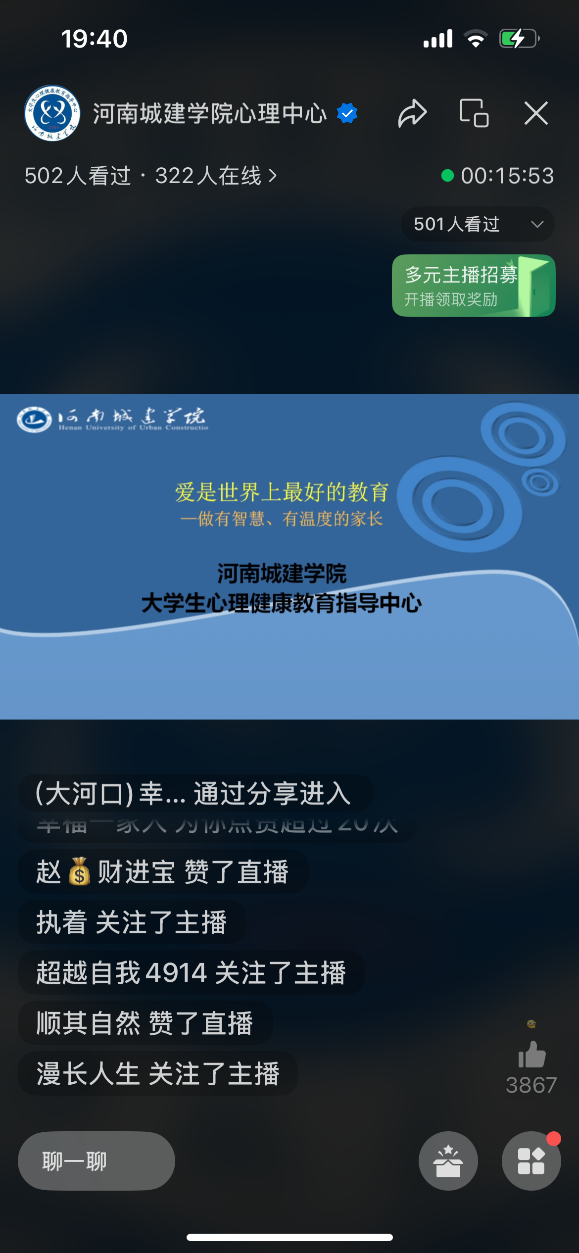 此次 “家校共育” 家长心理学堂是我校首次以线上直播的形式面向家长开展的协同心理育人工作的创新实践,为家长提供了专业的心理教育指导,也进一步凝聚了家校育人合力,推动了学校 “家校社” 协同育人体系的完善,为培养身心健康的新时代大学生奠定了坚实基础。